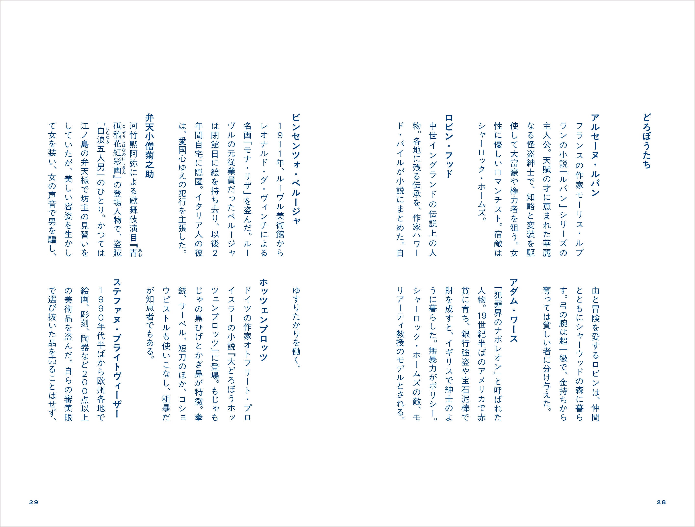 そう思う気持ちとはうらはらに、人々は昔からどろぼうに注目してきました。第一部では、物語や史実として語り継がれる「大どろぼう」12人を、イラストレーターの伊野孝行さんがユーモアたっぷりに肖像画として描き、彼らの名言とともに紹介します。