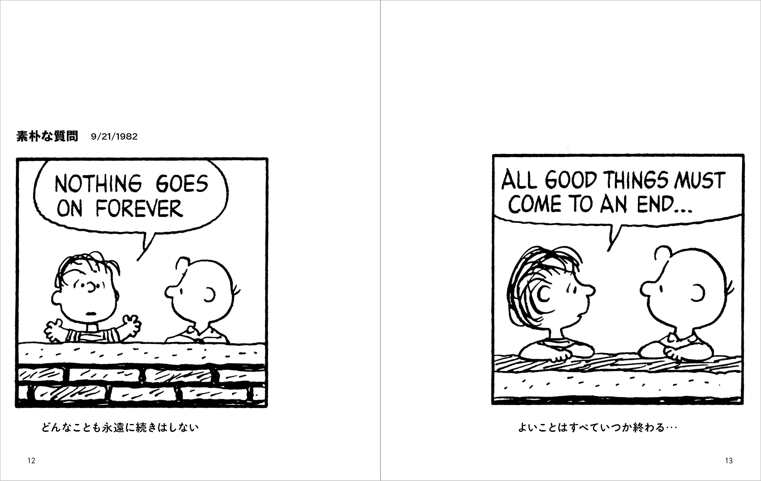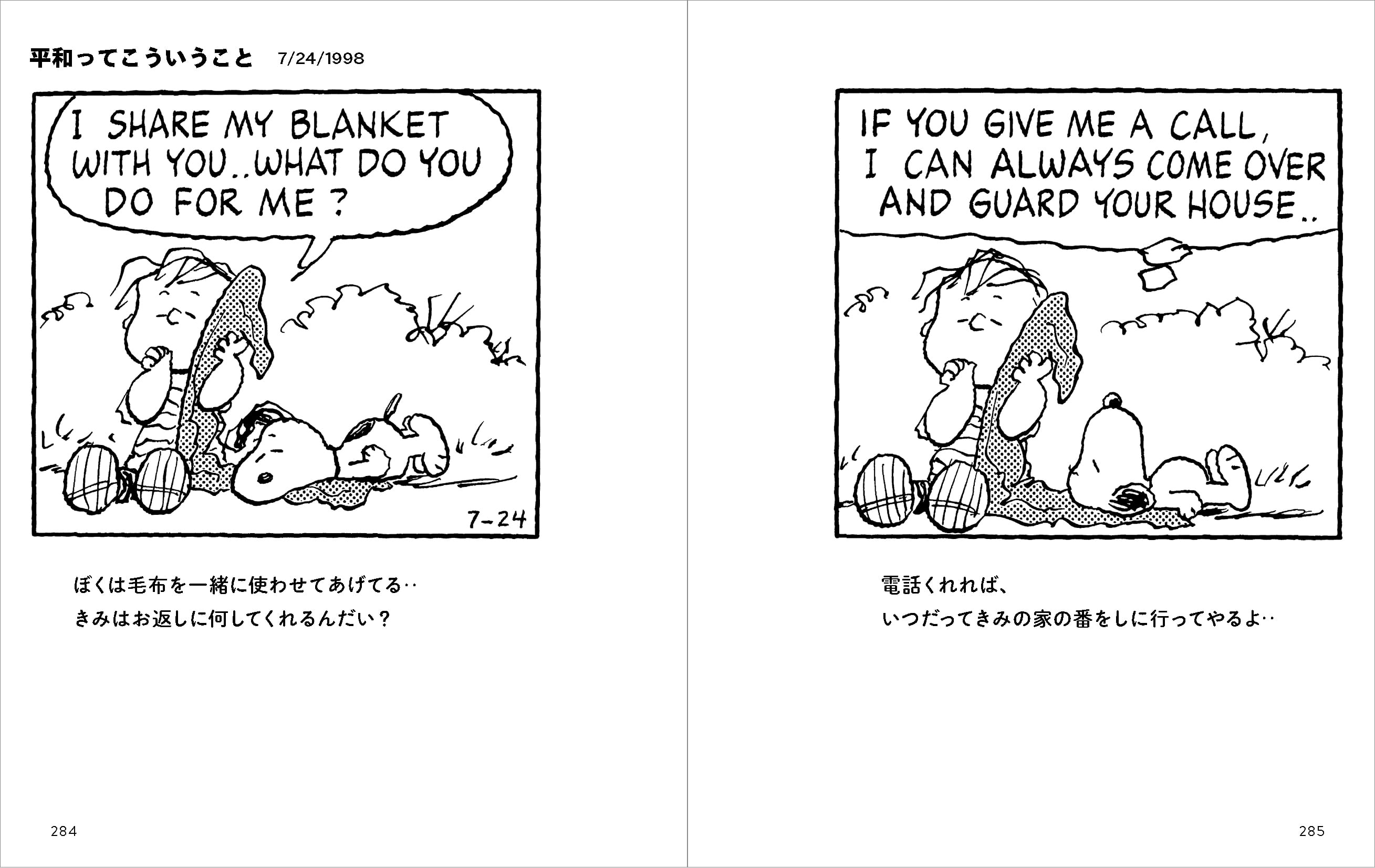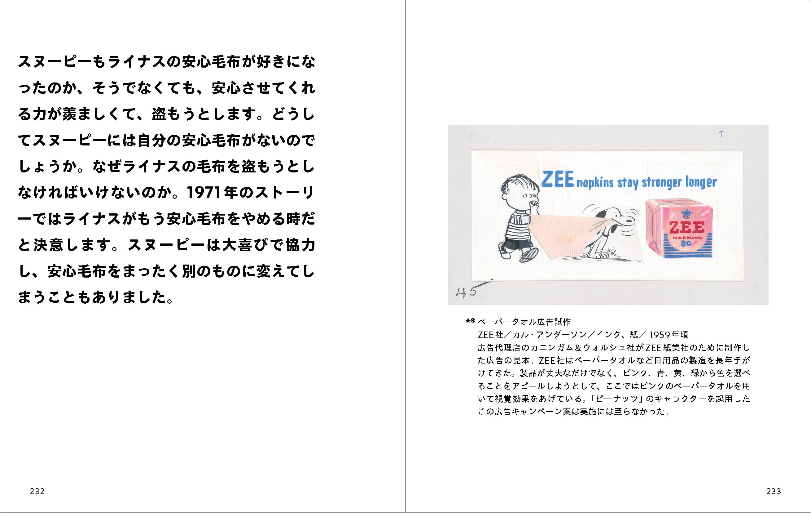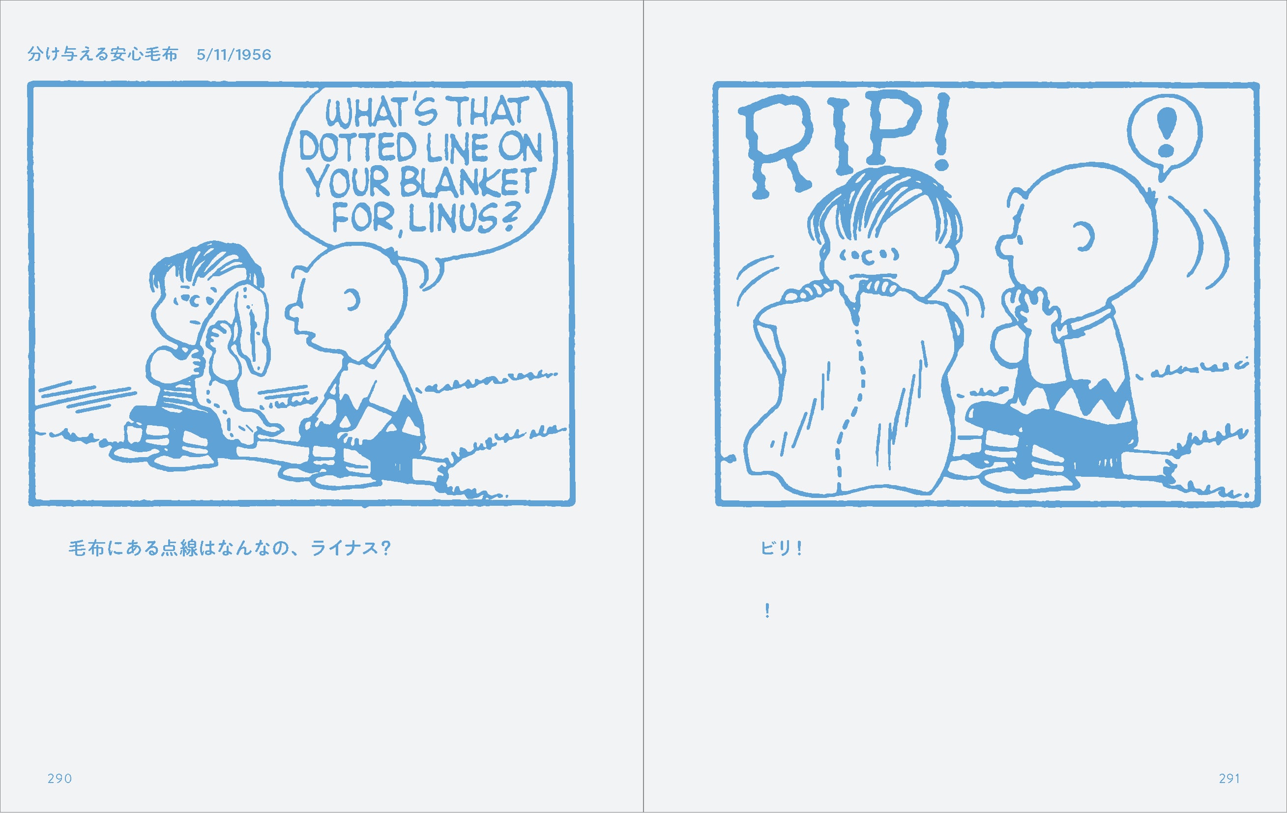 安心毛布の七変化も特別に収録。紙ひこうきになって飛び回ったり、ライナスがチャーリー・ブラウンとしあわせを分かち合いたい時には半分にするための点線が現れたりと、自由自在に変化する安心毛布はまるでライナスを守るスーパーヒーローのようで頼もしい!本書ではカバーとしても、活躍しています。