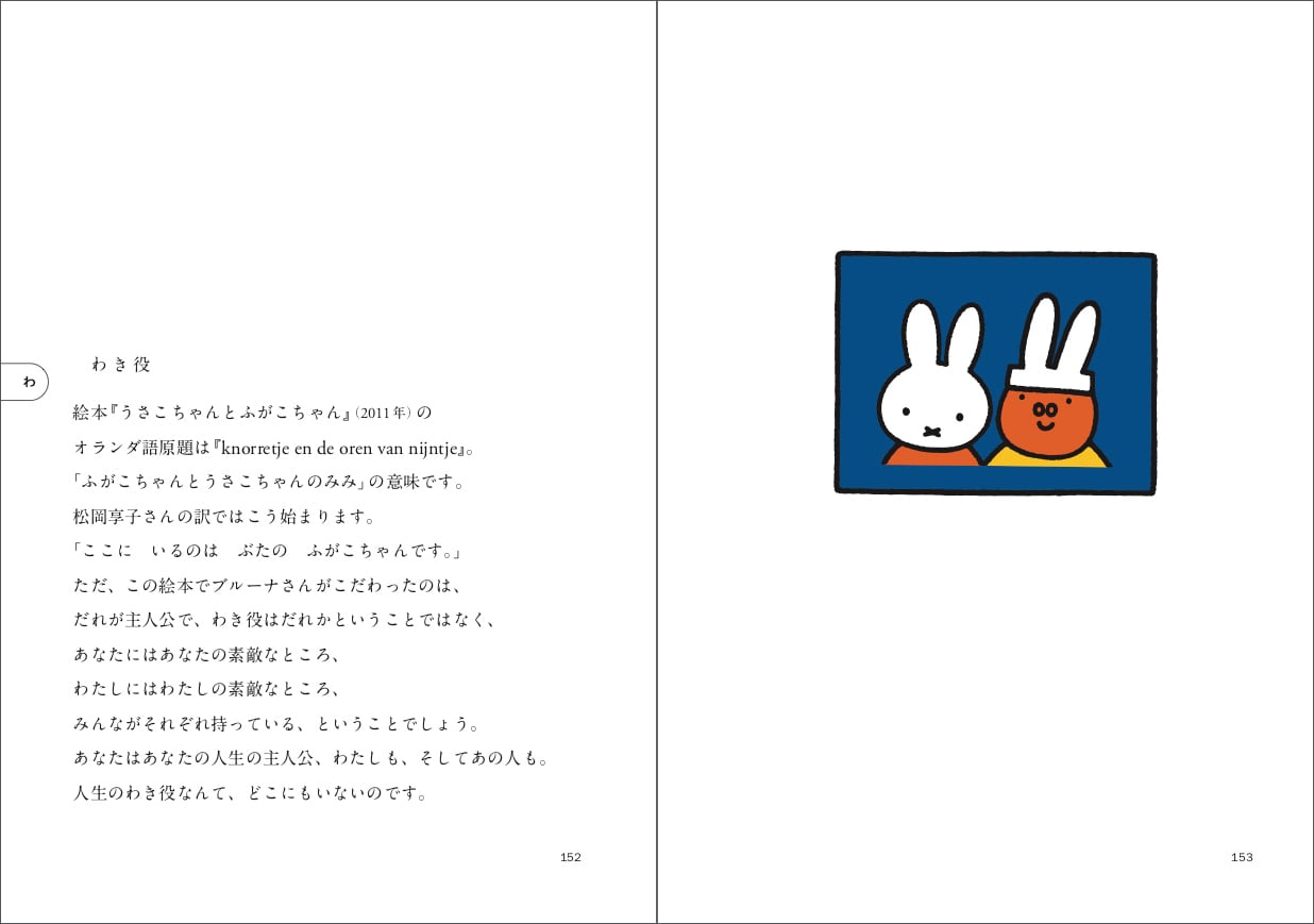 ミッフィー(うさこちゃん)が大好きで、作者ディック・ブルーナと親交のあった森本俊司さんが、「アイディアのもと」「うさぎ」「ぬくもり」「涙」「ユーモア」など、ミッフィーや作者をめぐる66のトピックスを紹介したポケットサイズの1冊です。