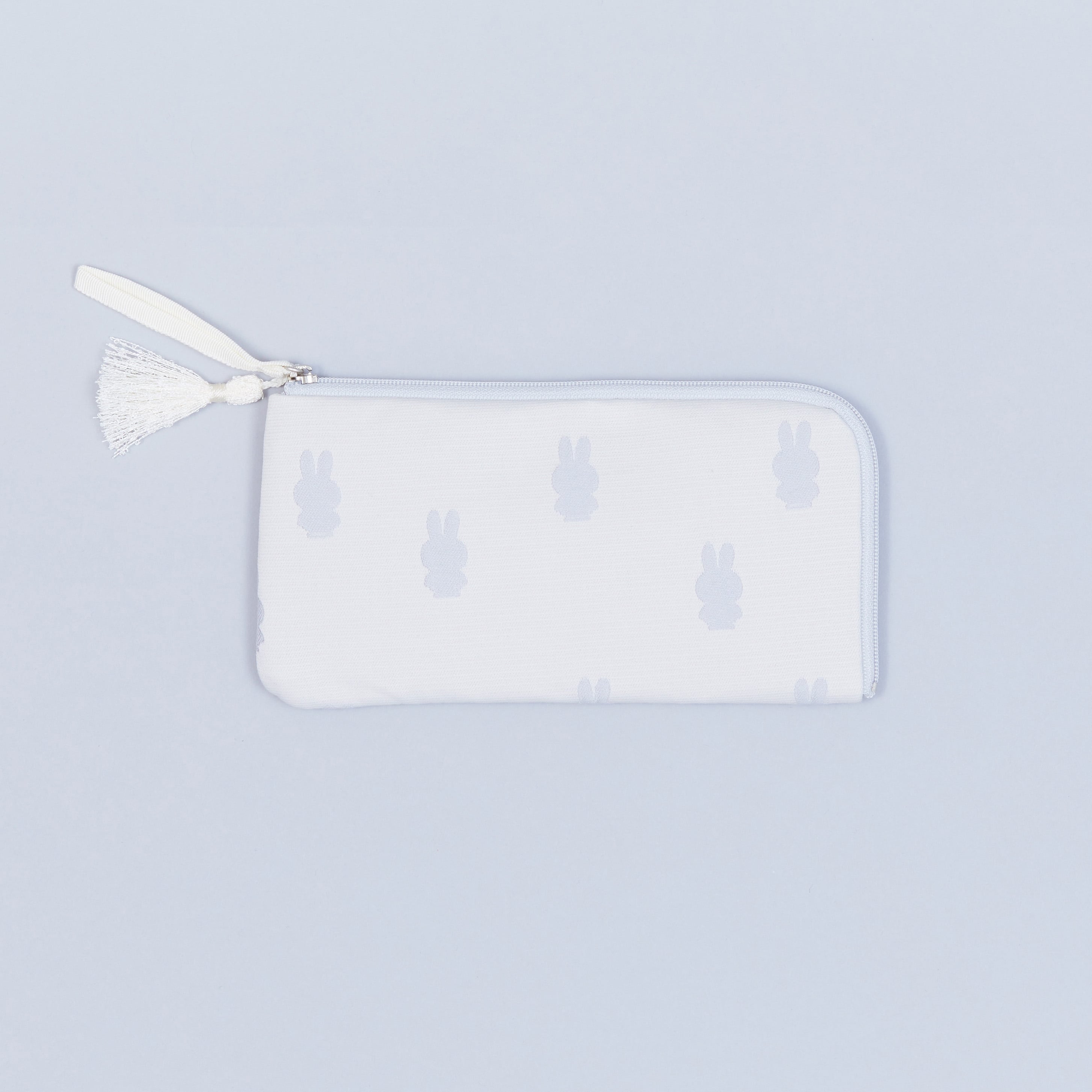 ミッフィーのシルエット部分がぷっくりとふくれるように織られているのが特徴的な生地です。ふっくらふわふわにするために、横糸は再生繊維のレーヨンと綿を使用しています。 レーヨンはフランス語で「光」という意味で、その光沢はまるで絹のような仕上がり。タッセルはミッフィーのシルエットに合わせた薄いグレーです。