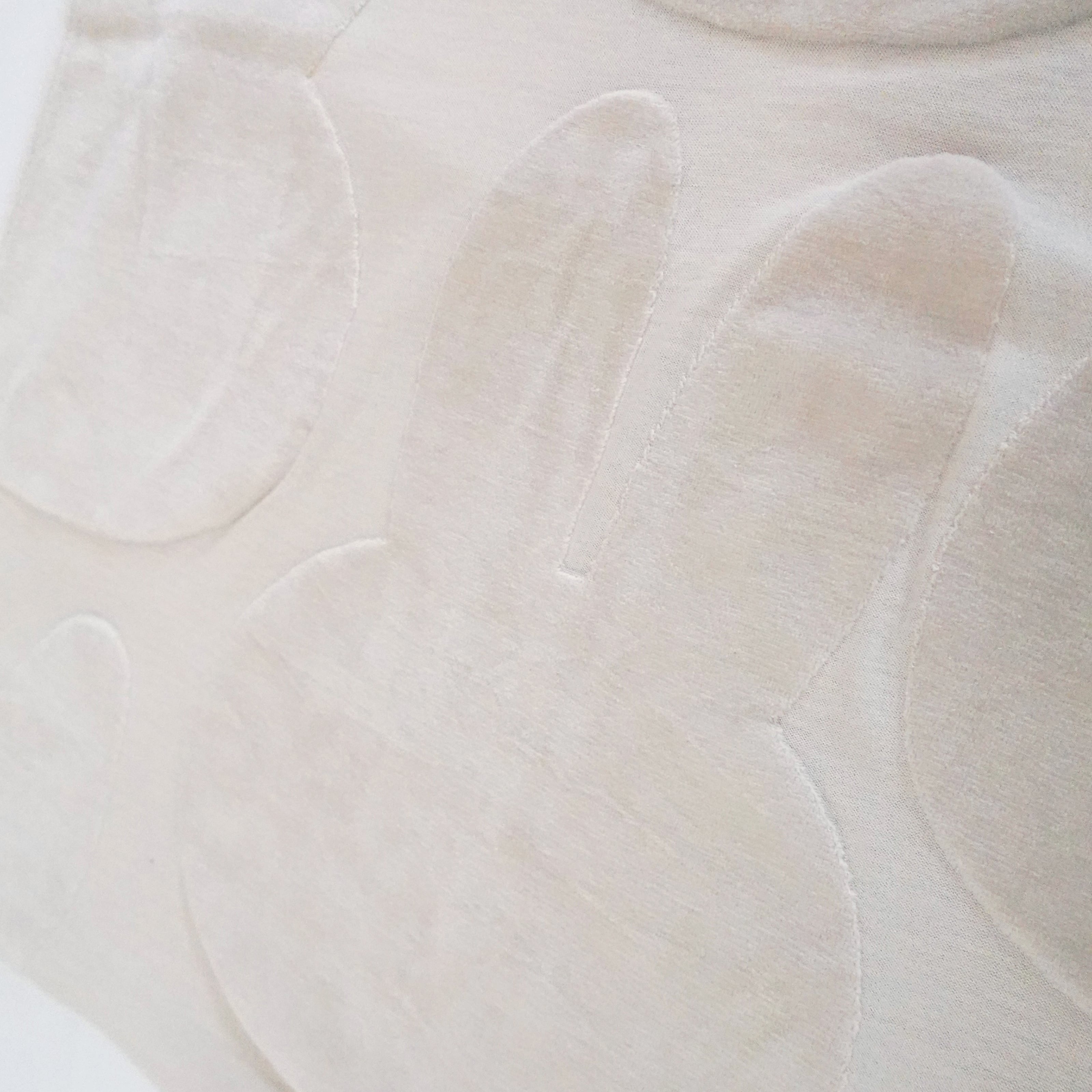 毛足を均一にカット加工する事により、 まるでベルベットの様な触り心地が特徴です。優しい色味でありながらも、大胆に配置された大きなミッフィーのシルエットが珍しいデザインになりました。