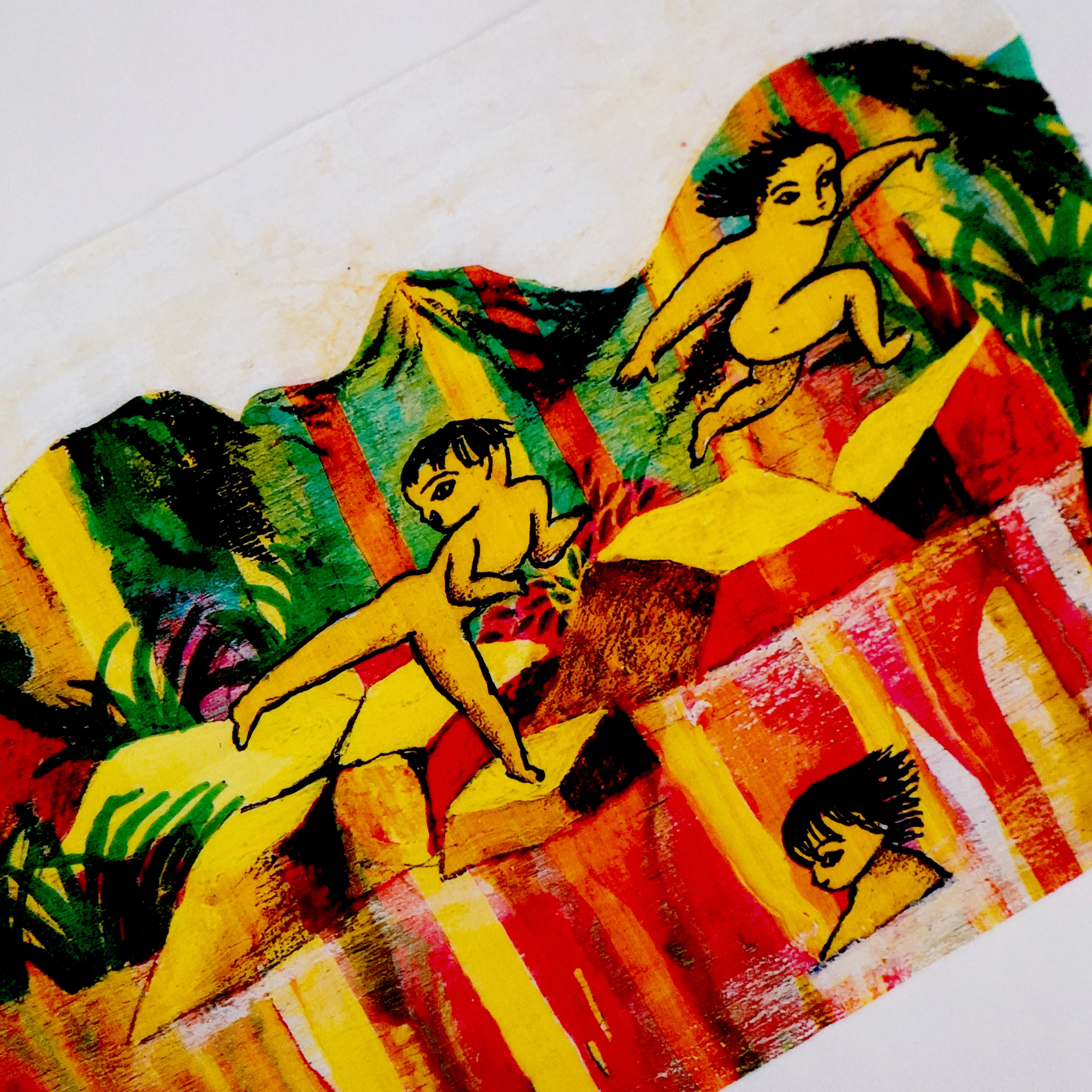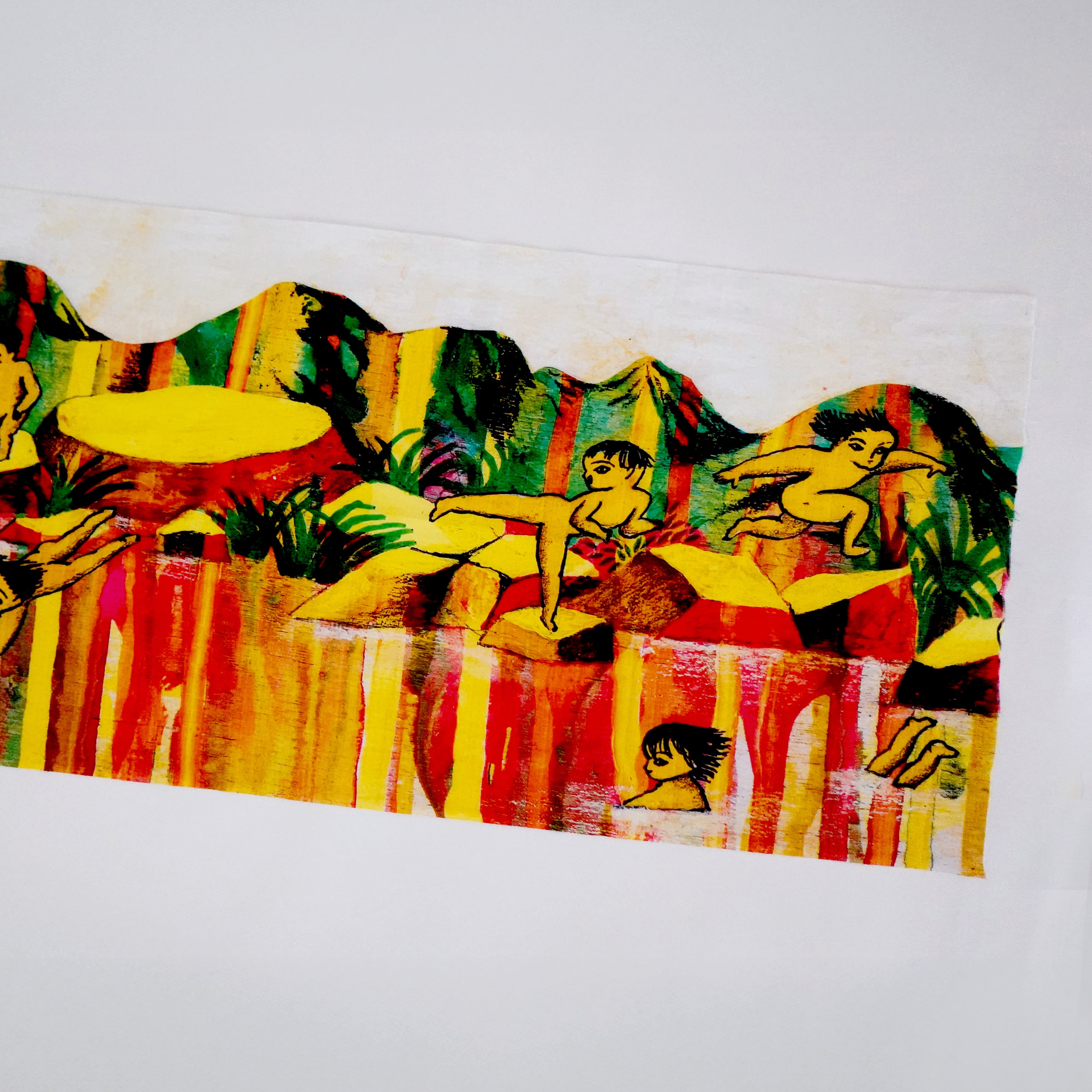 詩繪本・『童堂賛歌』から、「七・童堂賛歌」のシーンをピックアップし、インクジェットプリントでてぬぐいにしました。