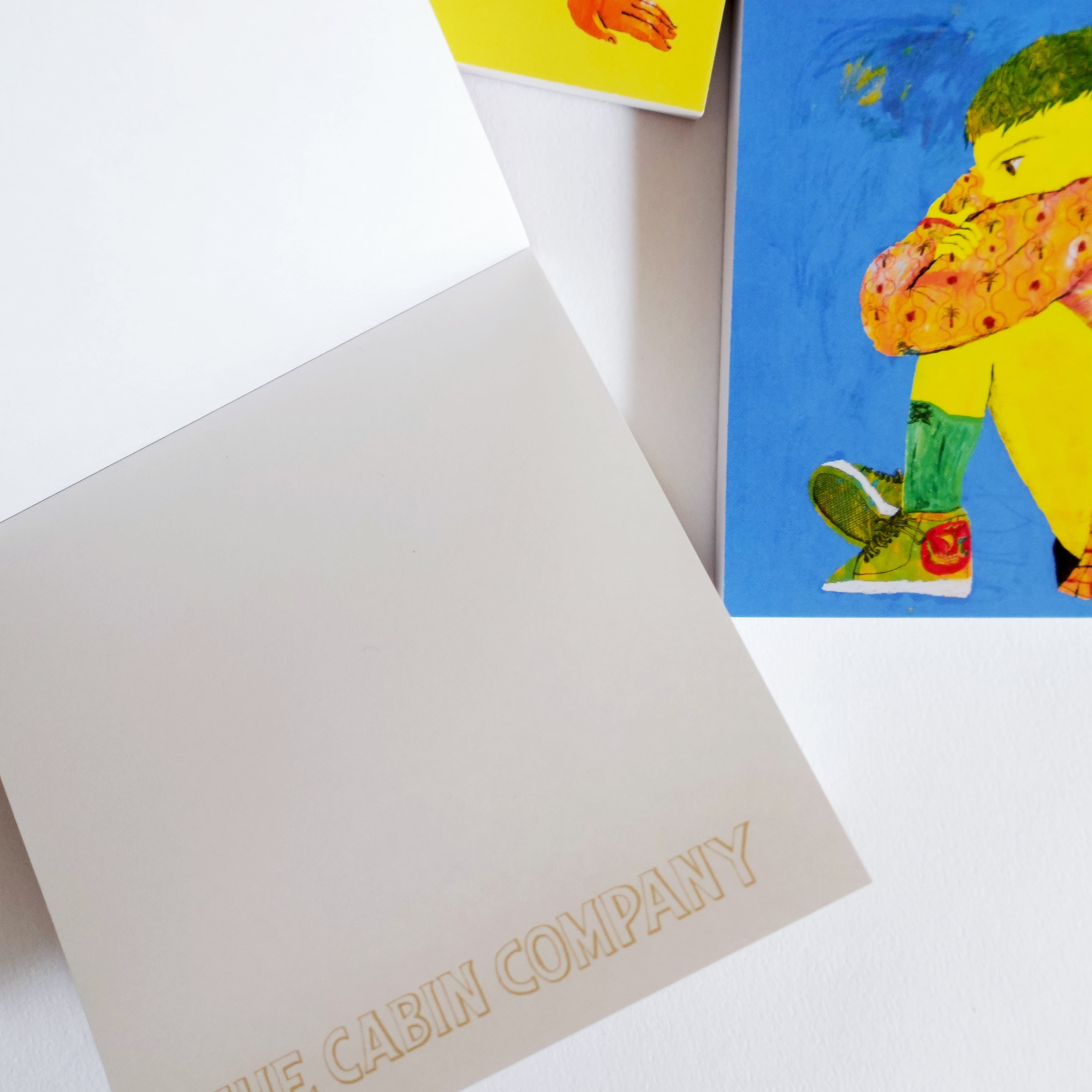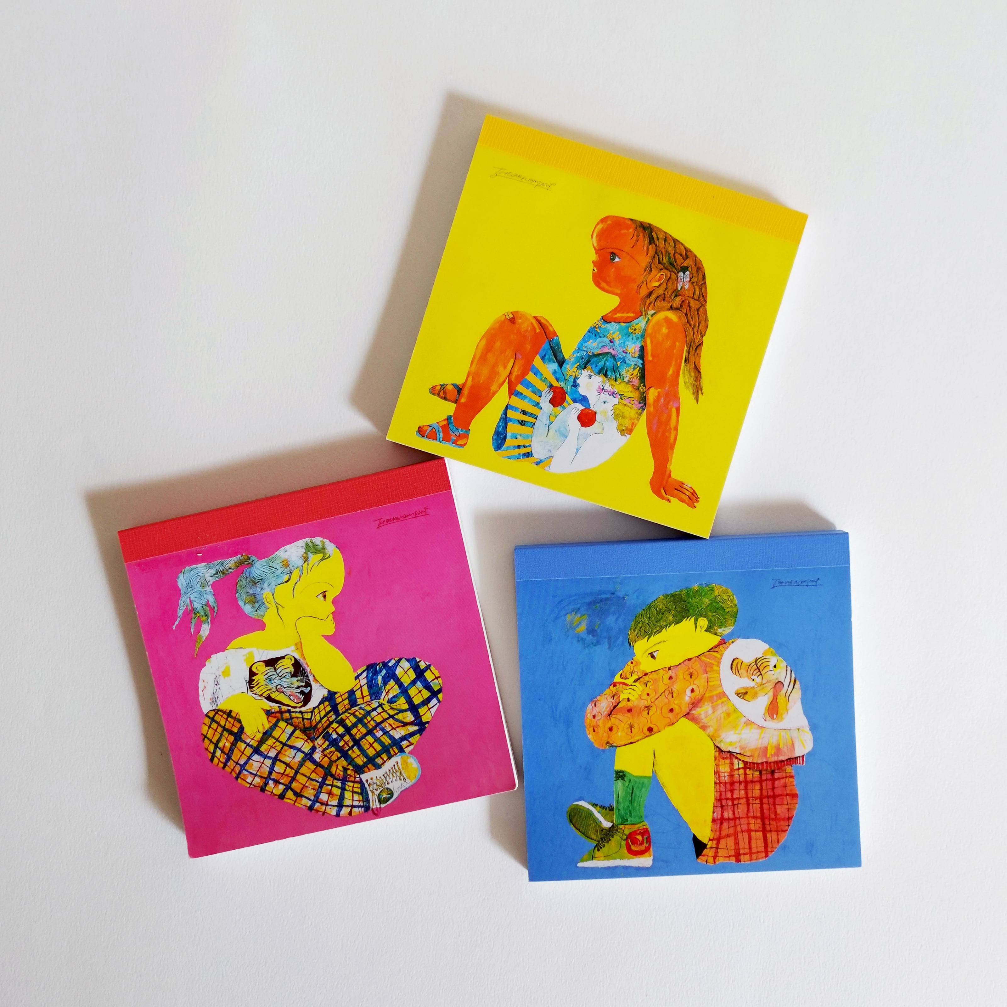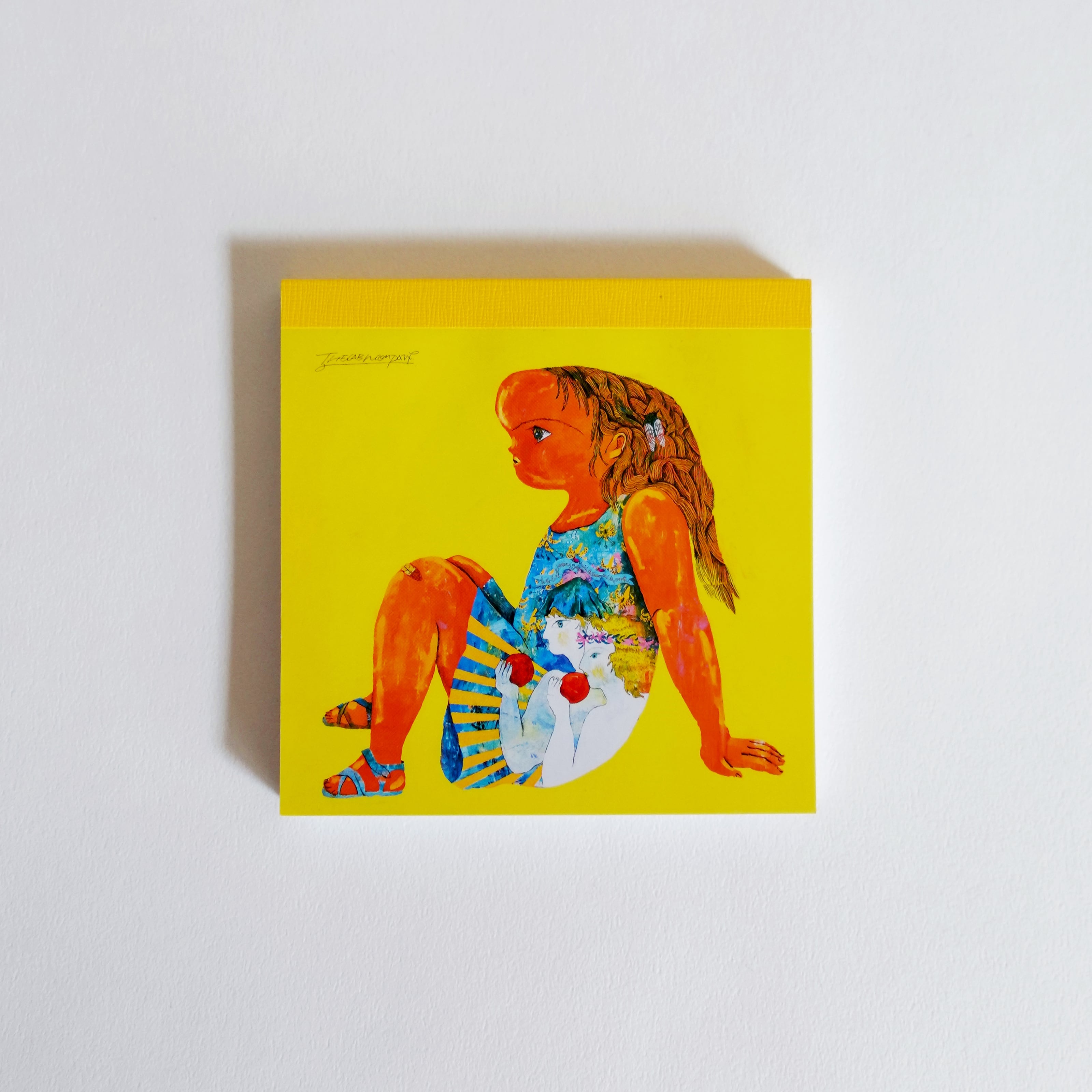 ザ・キャビンカンパニーの作品「かんがえるこども」を10cm角のメモブロックにしました。表紙は3種、中の紙は共通です。てのひらサイズがかわいく、3種類揃えてミニチュア作品のように飾ってもたのしい。ちょっとしたプレゼントにもよろこばれそうです。