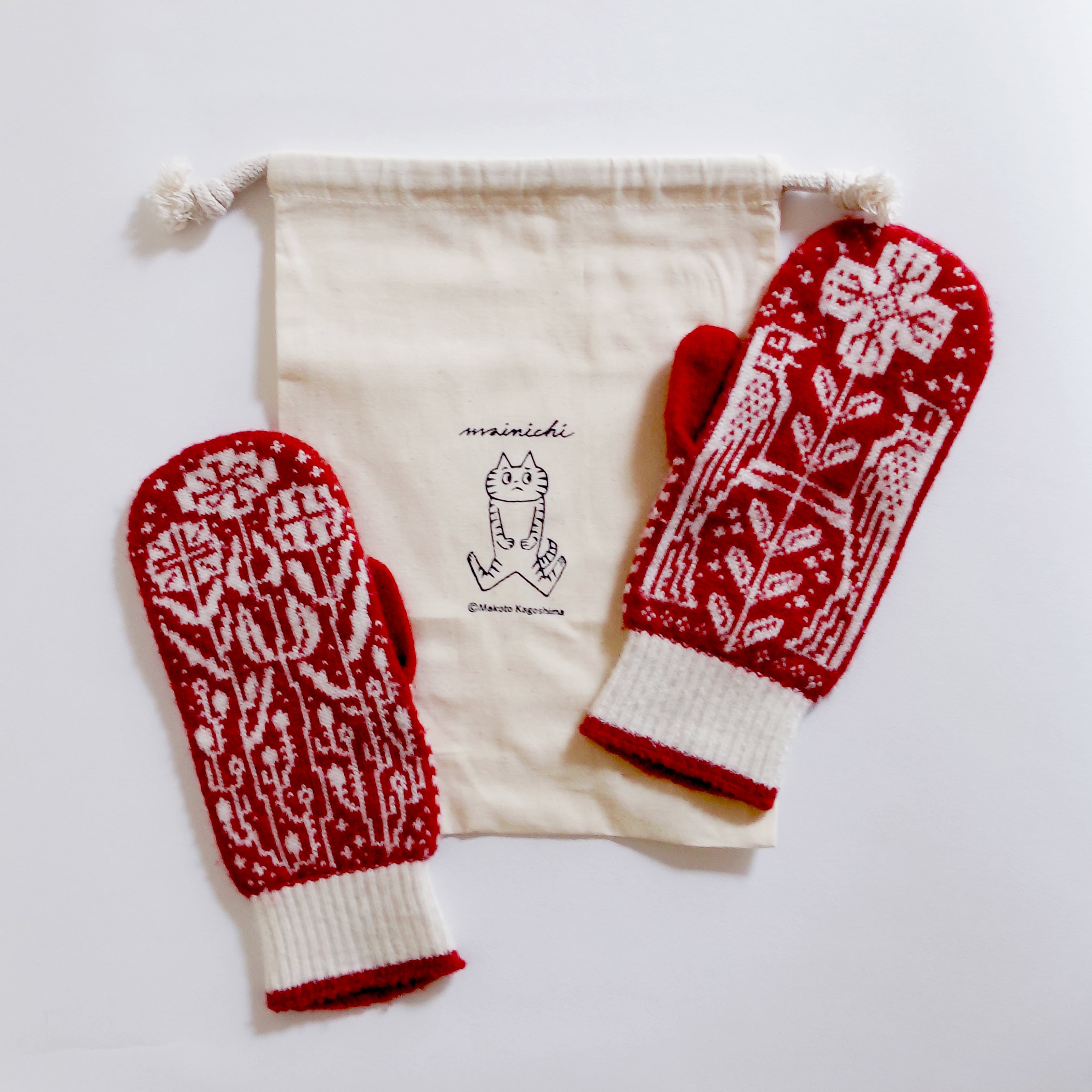 プレゼントの巾着はミトンを収納できるぴったりサイズ。シルクで刷ったネコの絵柄入りです。