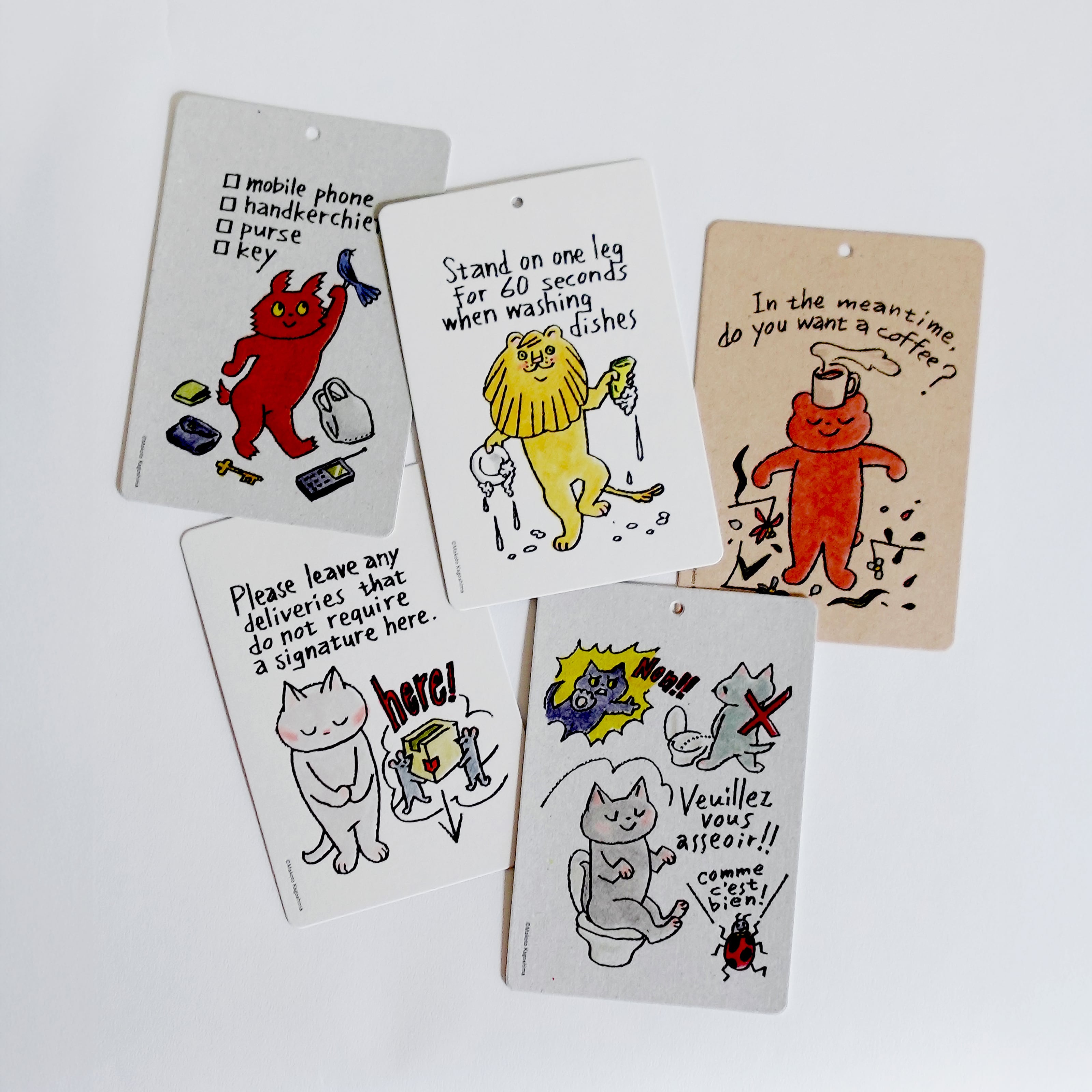 本展にあわせ、トイレ、キッチン、玄関などで使える5種類を鹿児島さんが描きおろし、プレートカードにしました。