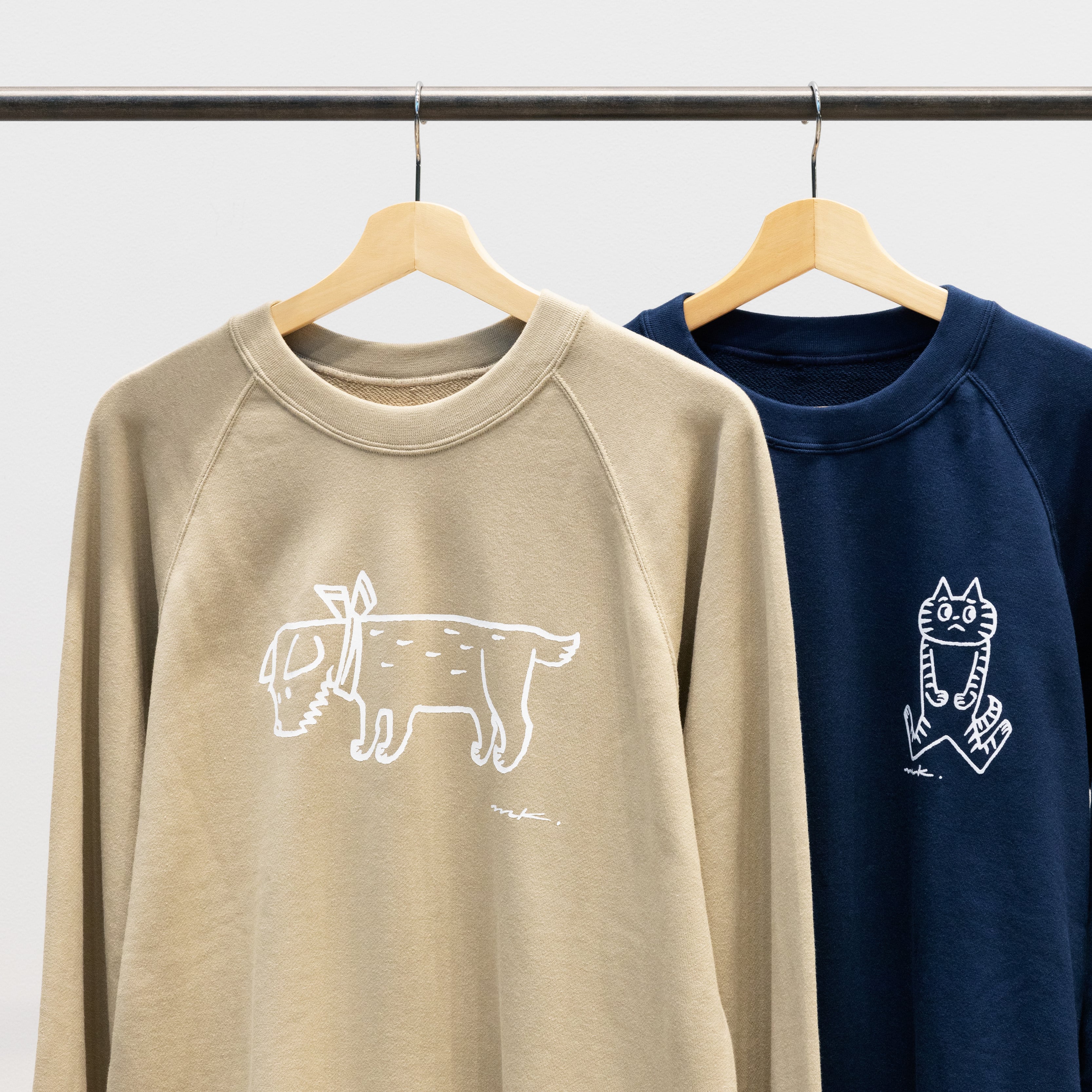 描きおろしのワンポイントのネコは、ふわふわとしたフロッキー加工で仕上げました。背面の首元にも、ワンポイントのチャーミングなイラスト入り。少し困った表情がかわいい。肌触りのやさしい、やわらかな質感のトレーナーです。