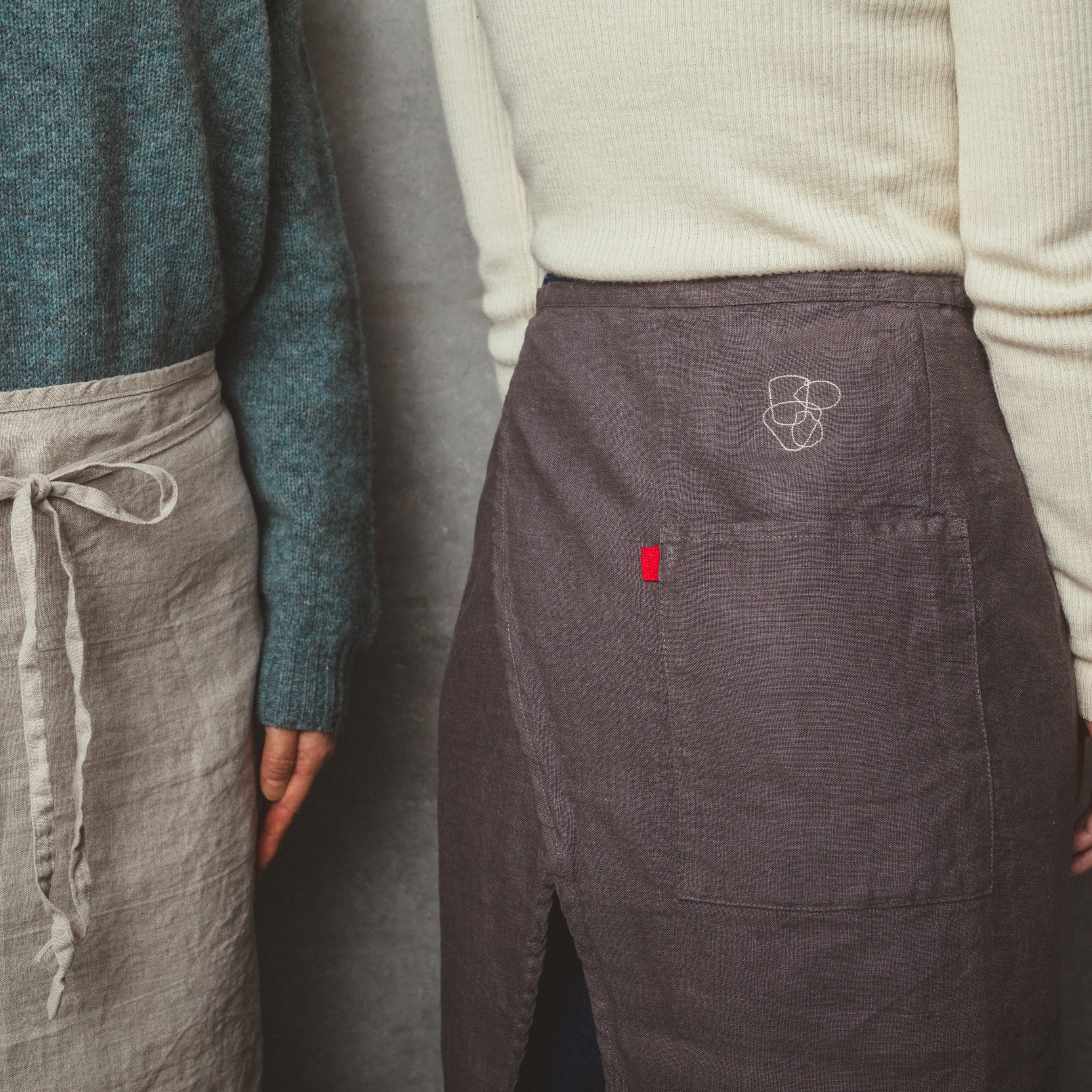 古くからリネンの生産地として知られるリトアニアで、ヨーロッパ北部の上質な亜麻(フラックス)を紡ぎました。丈夫な素材なので毎日気負わず使え、洗うたびにくたっと柔らかい風合いになり、その経年変化を愉しめます。リネンブランド「Lino e Lina」とのコラボレーションで、山野アンダーソン陽子のガラス作品のシルエットをモチーフにした、オリジナルのワンポイント刺繍が入っています。短め丈のカフェエプロンは、ミニマムながら汚れやすい部分をしっかりカバーしてくれます。