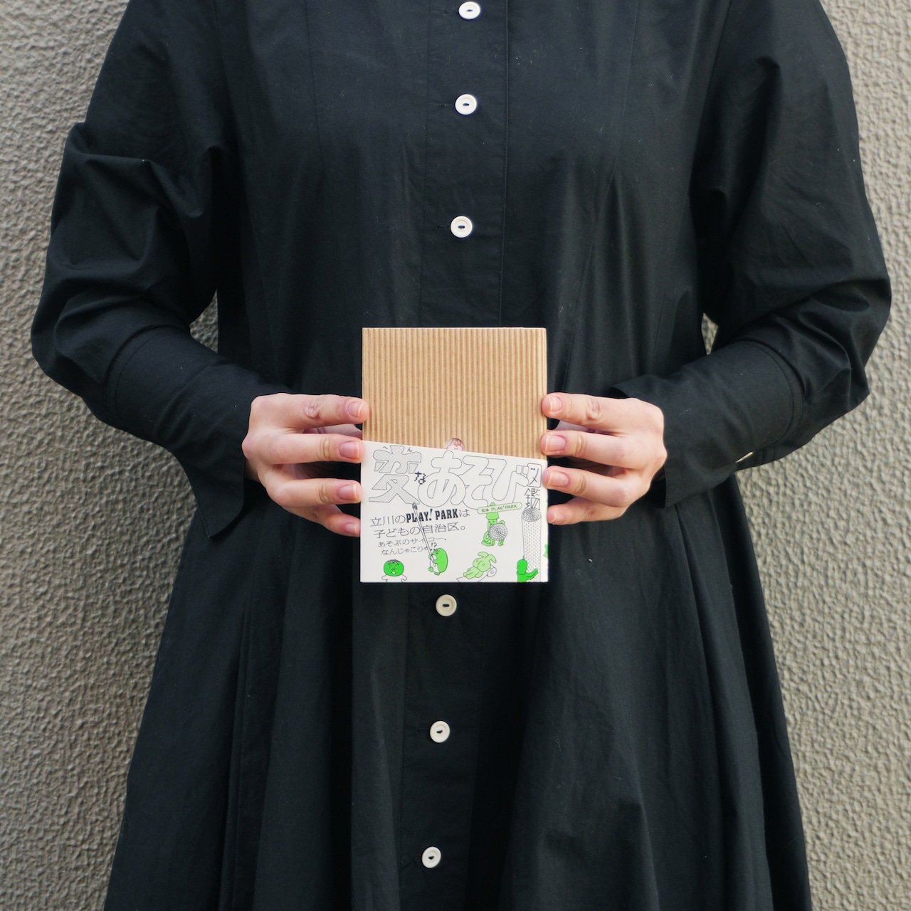 遊びは本のカバーにも。カバーは柔らかな段ボールで作られているので、へこんでいることもあります。でも、考えてみてください。へこみは、本が印刷され運ばれ、手元に届くまでに関わった人たちのリレーでできたもの。届いたカバーはもうあなたのもの。折ったり塗ったりへこませたり、唯一の『変なあそび図鑑』を楽しんでください。