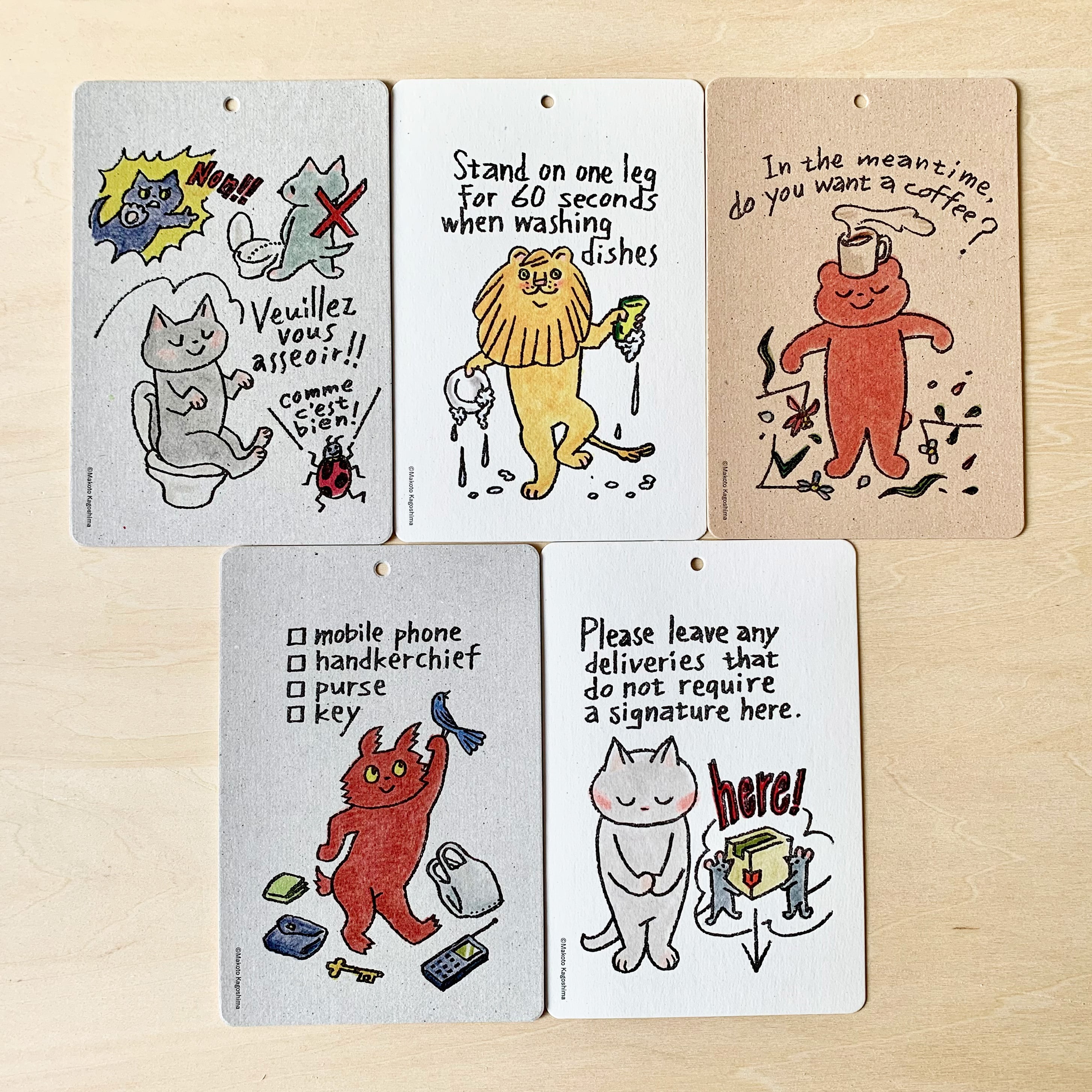 鹿児島家にはユーモラスなイラストが描かれたサインが置かれています。本展にあわせ、トイレ、キッチン、玄関などで使える5種類を鹿児島さんが描きおろし、プレートカードにしました。